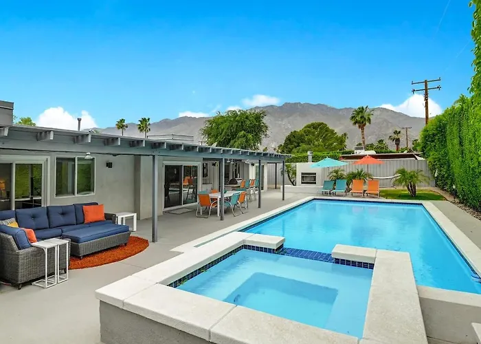 Teal And Tangerine Retreat - Alice Lodging villa features an equipped kitchenette where guests can find an electric kettle, a toaster, and kitchenware. This Palm Springs accommodation is in the vicinity of restaurant McDonald's. The nearest Palm Springs International airport is 5 km away from the 3-bathroom villa. After a day of exploring Palm Springs and its attractions, you can take a refreshing swim in a private swimming pool or enjoy a private garden at the holiday home.